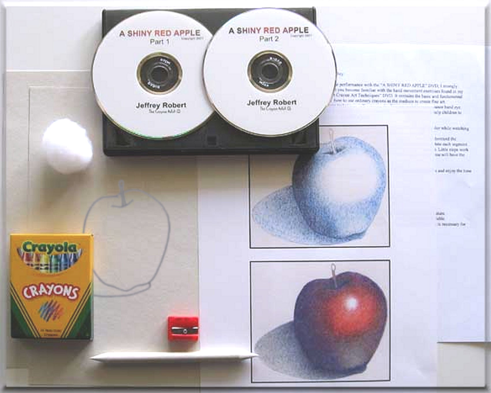 The “A Shiny Red Apple” video DVD is a visual step by step tutorial in real time by Jeffrey Robert demonstrating his fine art crayon techniques. Separated by chapters, this DVD is designed to work with the pause and play feature of your video component. You are able to stop the video, begin your application, monitor your progress and adjust and compare your drawing with that of “The Crayon Artist”.