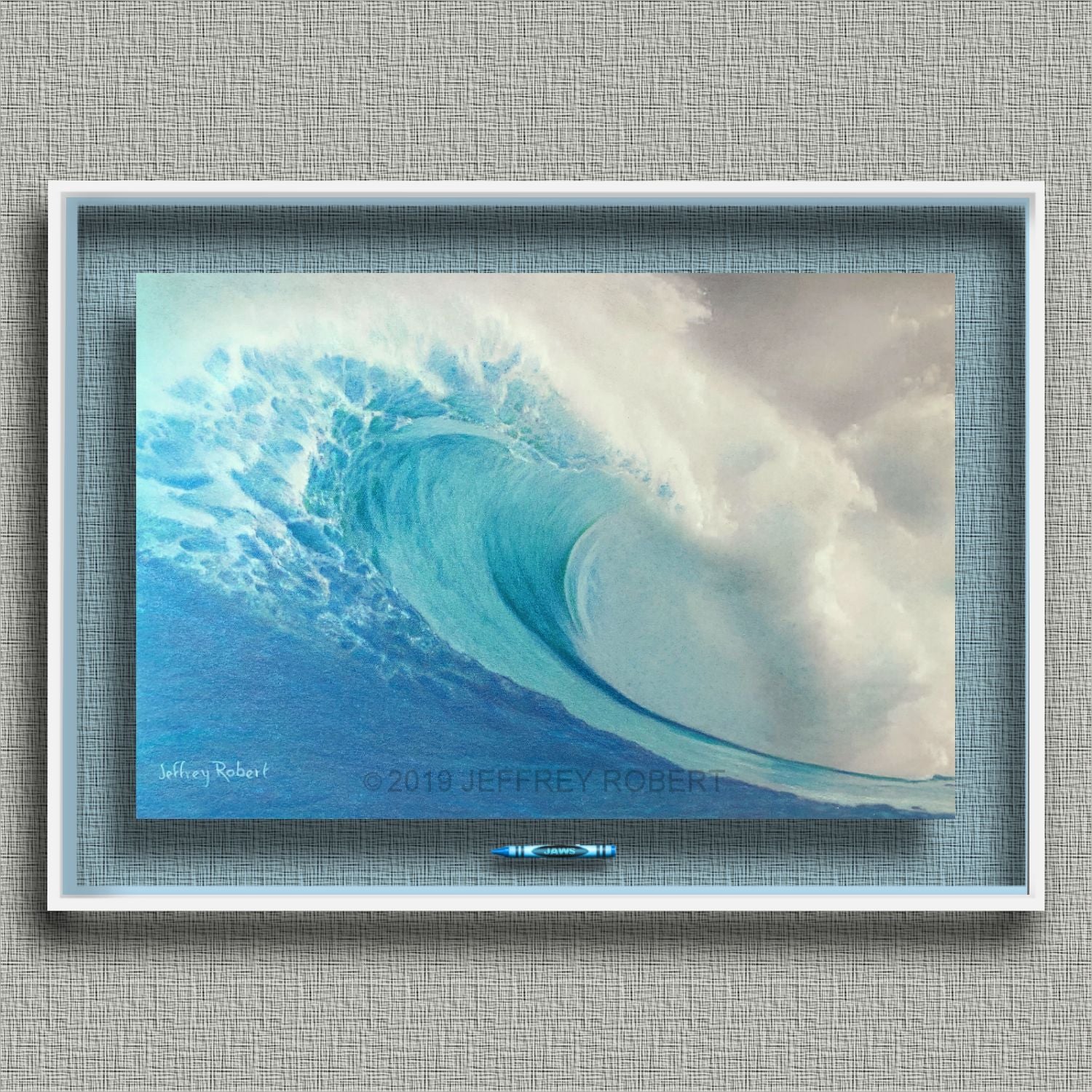 FRAMED CRAYON ART SHOWN IN WHITE FRAME WITH FLUORESCENT ICE BLUE ACRYLIC. FRAME AND ACRYLIC COLOR OPTIONS AVAILABLE.