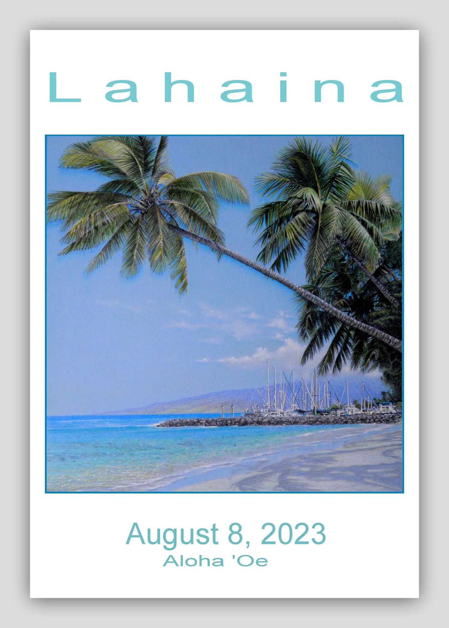 The top of the white border says LAHAINA,MAUI. The bottom says August 8, 2023, Aloha Oe.